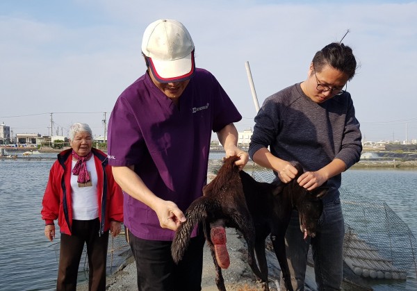 台灣動物緊急救援小組接獲通報,在高雄興達港附近,出現一隻流浪犬,「尿尿的地方掛著一節腸子」,民眾以為是車禍造成肚破腸流,經救援人員確認後是一隻患有子宮脫垂母犬,所幸及時營救至動物醫院進行手術治療,救回一命。