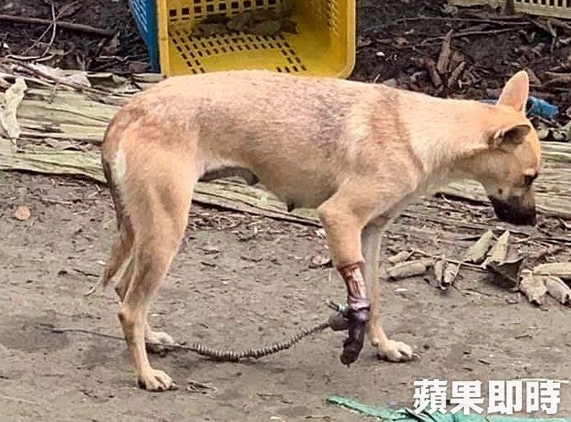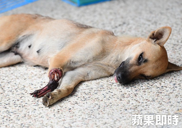 台灣動物緊急救援小組獲報後,大隊長倪兆成率救援人員冒雨趕往現場搶救,經搜索後發現傷犬在一處破舊工寮內;救援小組人員雙面包夾,終將腿部重傷的小黃狗順利捕捉,並送往動物醫院搶救;但傷犬因傷口支離破碎,白骨外露,為了避免引發敗血症,將在今進行截肢手術保命。