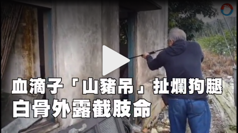 動物血滴子「山豬吊」扯爛狗腿!動保團體昨接獲通報,趕往高雄旗山圓潭國小後方草叢,營救一隻遭鋼索繩陷阱(俗稱山豬吊)扯爛腿的流浪黃狗,將牠緊急送往動物醫院搶救。因傷口支離破碎,白骨外露,將在今進行截肢手術,希望能保住黃狗一命。