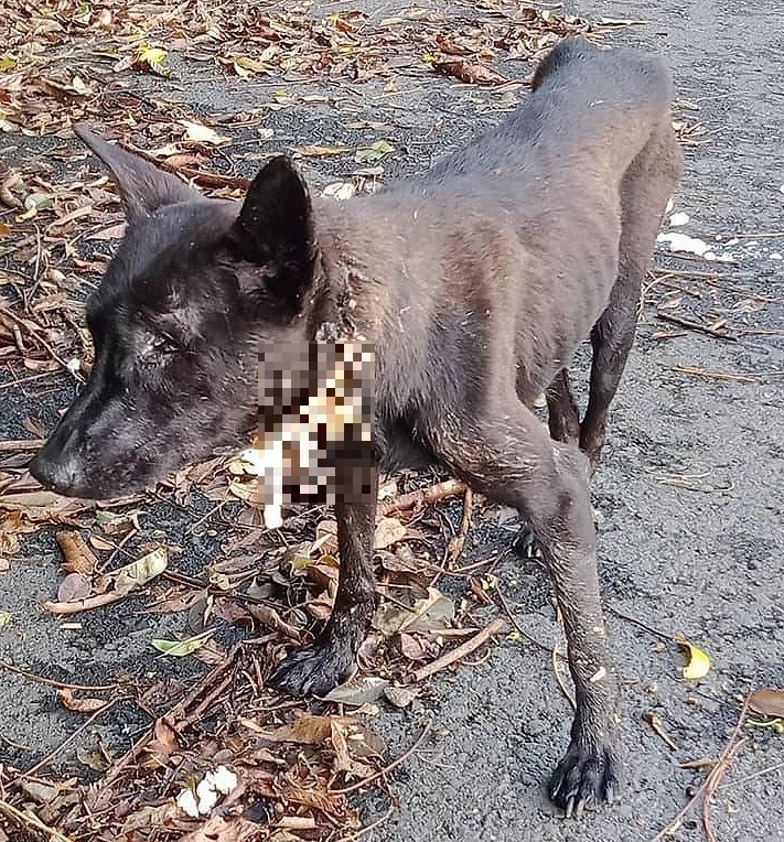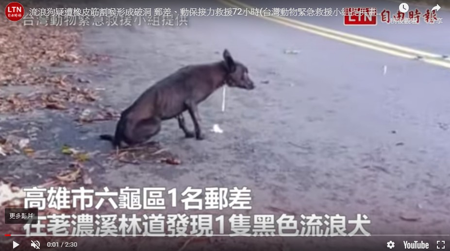 高雄六龜郵局1名戴姓郵差,近日送信途經荖濃溪林道指標5公里處,發現1隻黑色流浪犬在路邊進食,沒想到食物吃進口中後,竟不斷從脖子下方流出,模樣嚇人,他湊進一看,才發現狗兒頸部竟破了一個大洞,他拍照後,向台灣動物緊急救援小組通報。