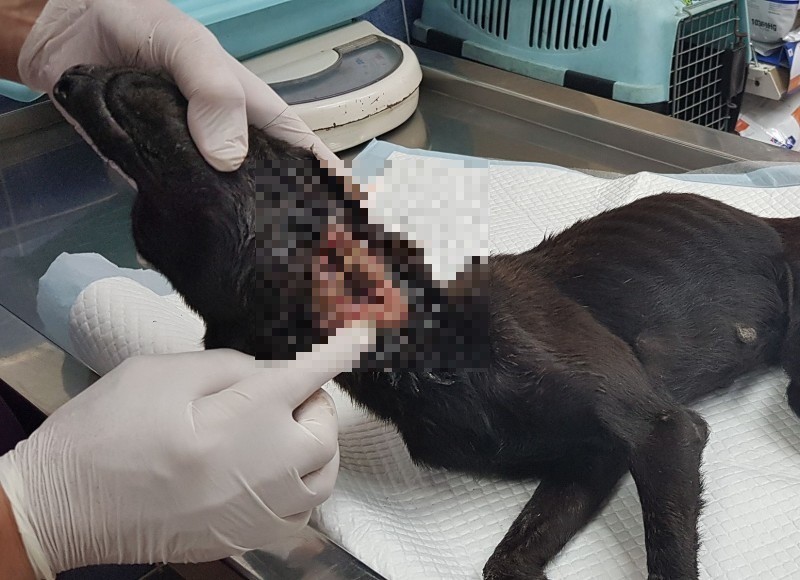 台灣動物緊急救援小組獸醫團隊表示,傷犬是一隻約8歲母犬,到院時狀況危急,血壓偏低,連抽血都有困難,頸部下方遭異物切割約直徑5公分大缺口,食道與氣管外露,感染嚴重。
