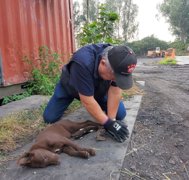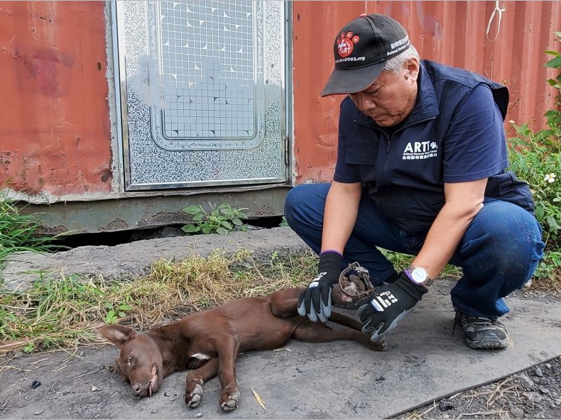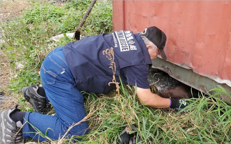 台灣動物緊急救援小組大隊長倪兆成獲報後,率志工團隊與隨行獸醫師趕赴現場搶救。大夥兒抵達現場後,發現這隻受困捕獸夾的幼犬可能因害怕,躲藏在一處貨櫃屋下方,恰巧獸夾上的鐵鍊又卡住貨櫃屋底部的雜物,讓牠動彈不得。倪兆成整個人鑽爬至貨櫃屋下方,費好一番功夫,才將傷犬抱出。