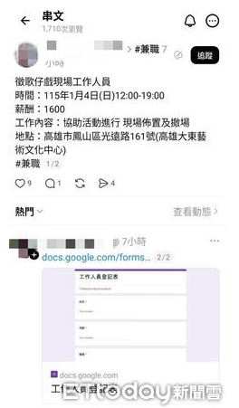 生命教育公益演出竟成詐騙新目標!由「台灣動物緊急救援小組」攜手昭錦歌仔戲坊及高雄市傳統戲曲推廣教育協會籌備近兩年的生命教育戲劇《藝起集愛、浪愛無限》,預計2026年1月4日在高雄大東藝術文化中心登場,然近期有詐騙集團假冒主辦單位名義,在社群平台發布「徵求活動工作人員」貼文,疑詐騙個資,台灣動物緊急救援小組籲小心受騙。