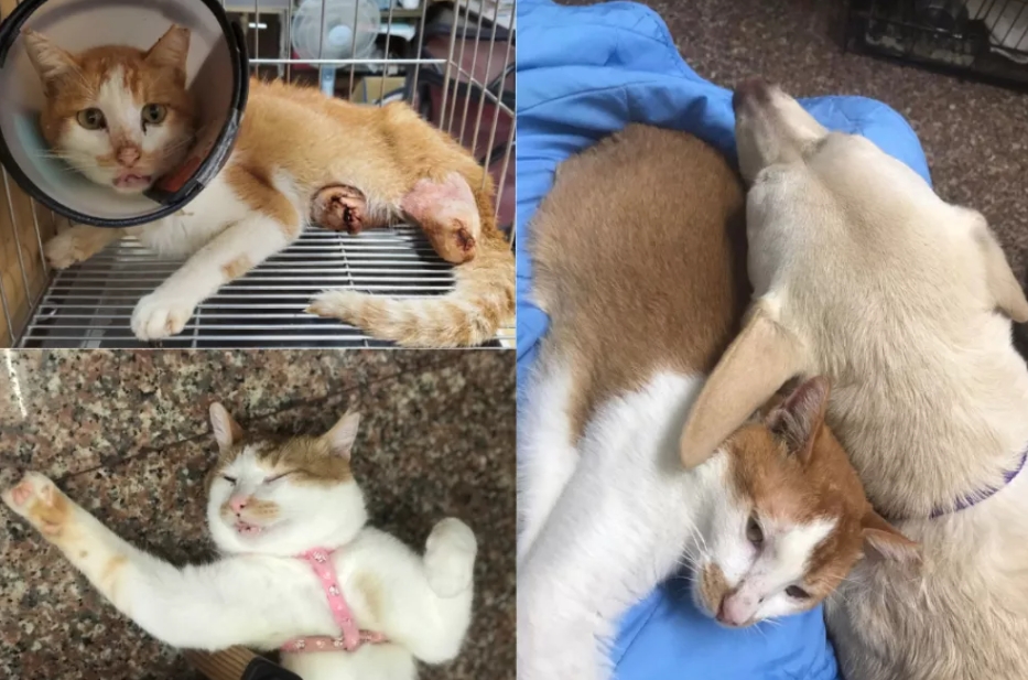 還有一隻貓咪「薯餅」,牠是不幸誤入捕獸陷阱的受害者。被好心人發現時,牠拖著僅剩白骨的雙後腿勉強行走,右前腳的腳趾也不翼而飛。獸醫師為牠進行了截肢手術,截去僅剩下白骨的後腿。雖然血檢發現薯餅染有貓愛滋病毒且身體殘缺,讓牠的送養之路困難重重,但薯餅個性親人親狗,堪稱「天使貓貓」。所幸,最終透過台灣動物緊急救援小組的媒合,照顧牠的中途家庭決定認養牠,現在的薯餅過著幸福快樂的日子,還胖了不少呢!