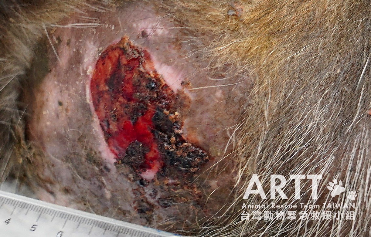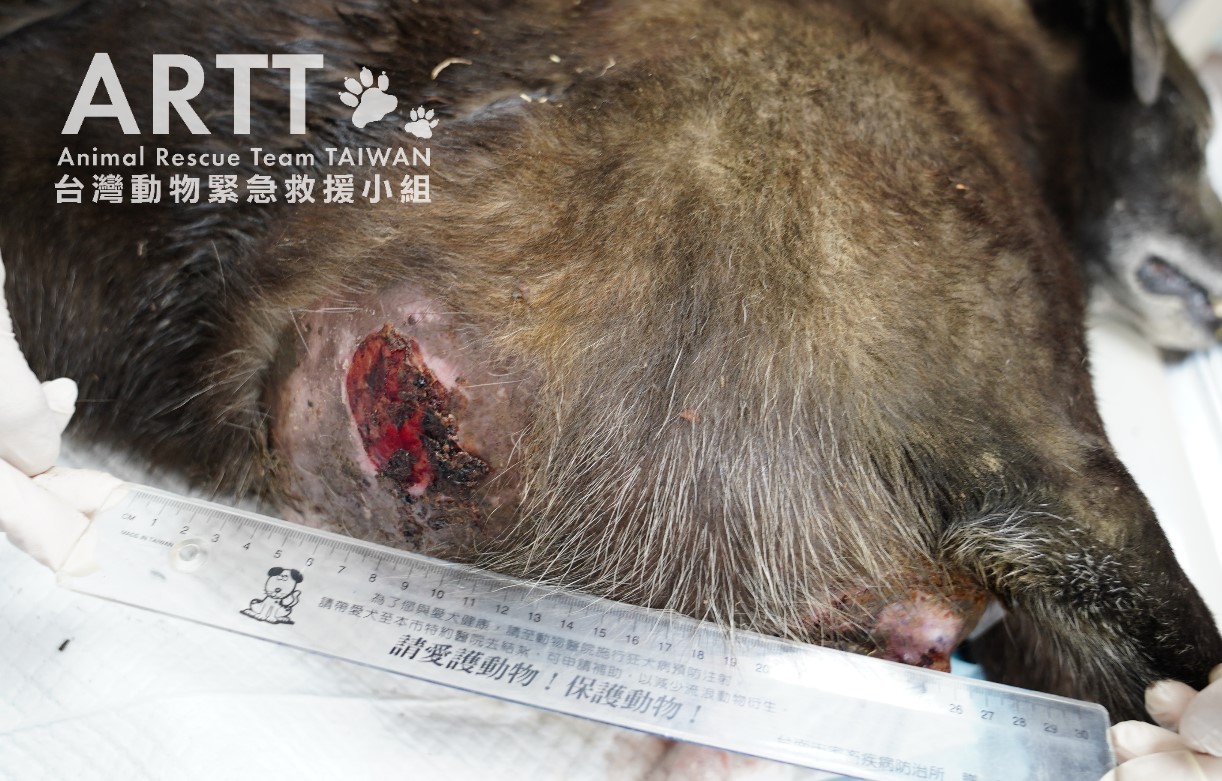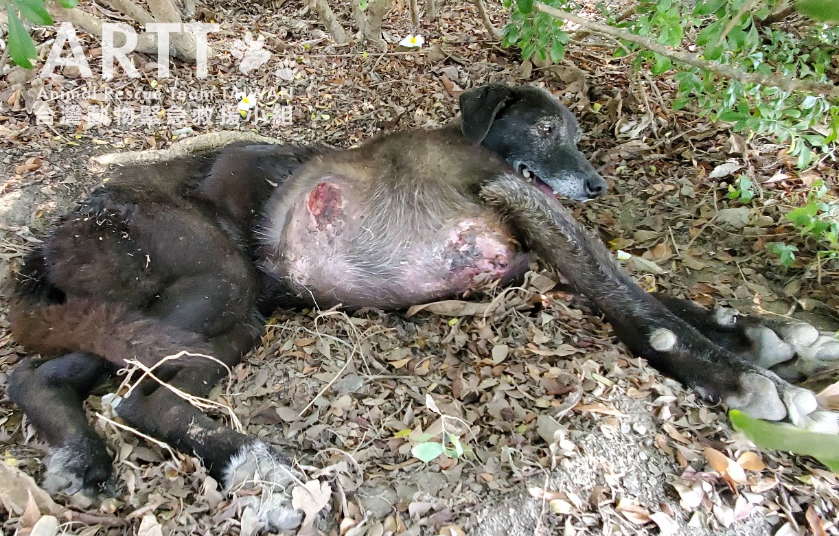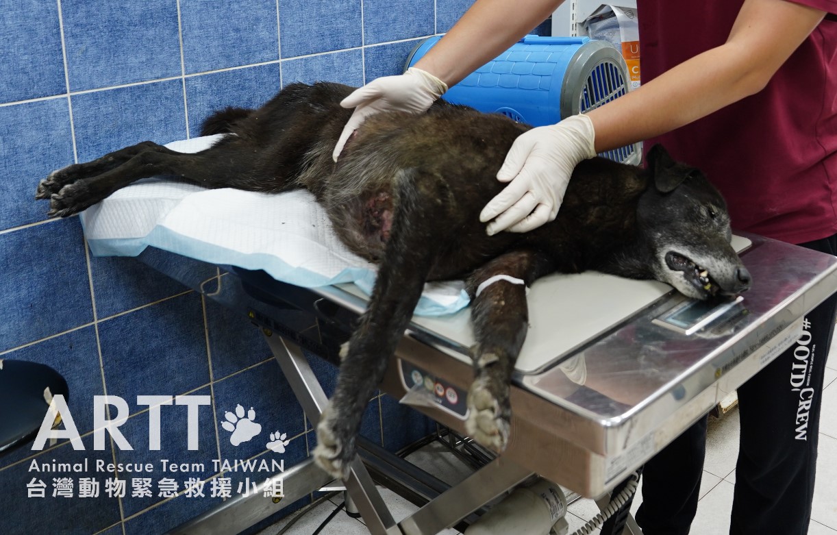 經台灣動物緊急救援小組醫療團隊診斷後,該犬年紀很大,研判有10歲以上,初部診斷應為胸部乳房惡性腫瘤合併淋巴轉移,外表已潰爛出血;腫瘤已長大到直徑超過30公分,是救援人員20多年來首見。