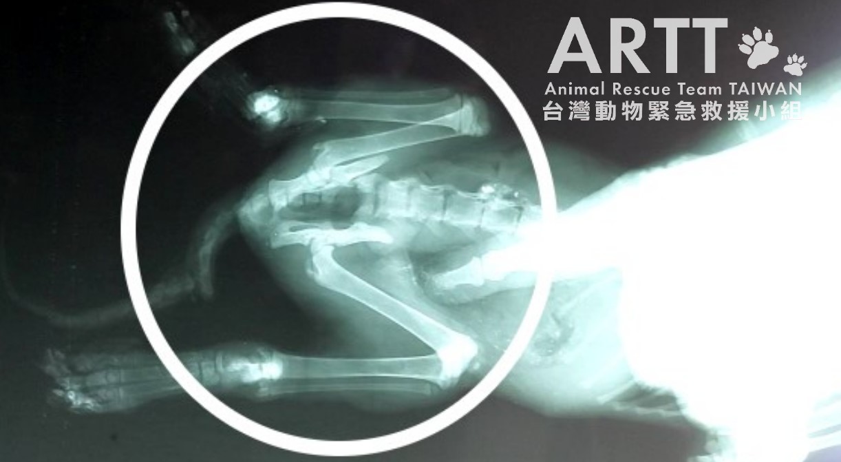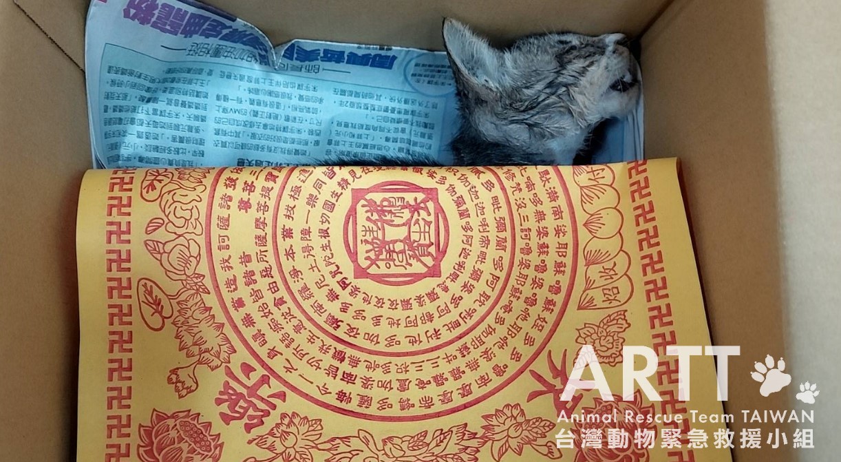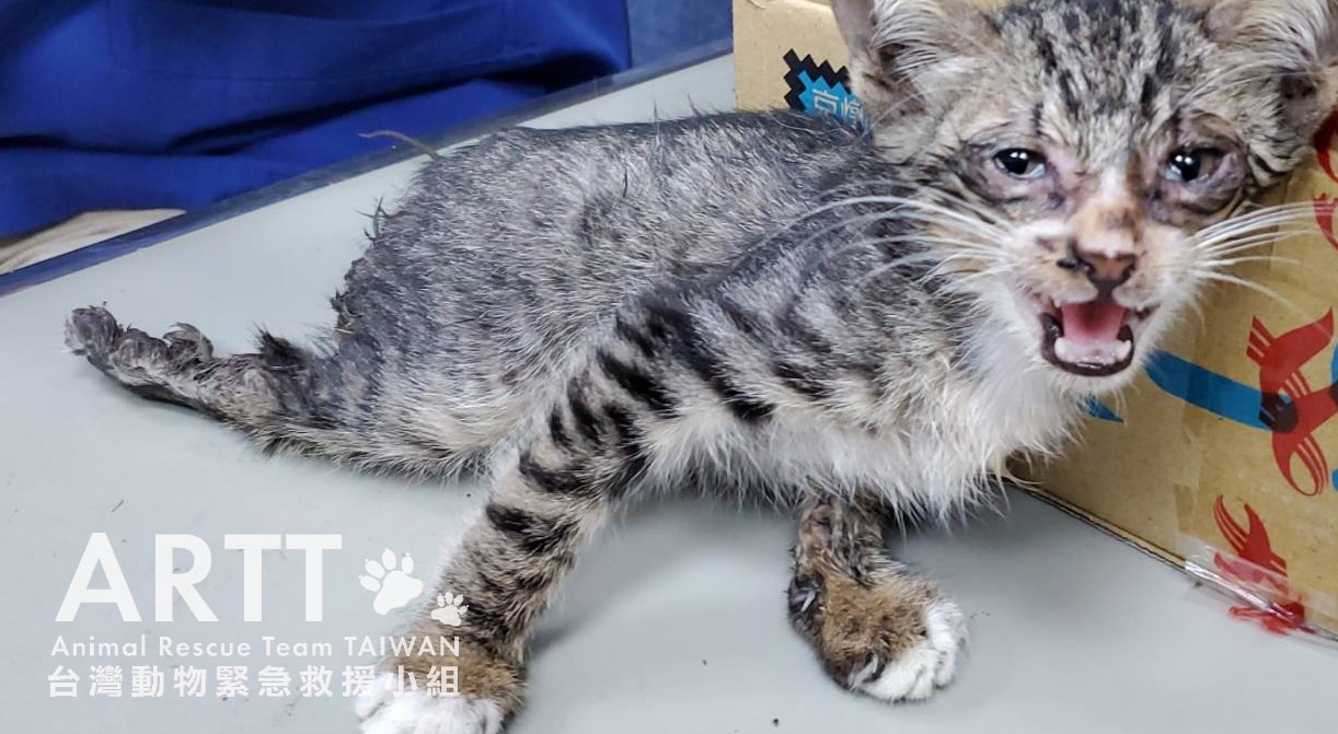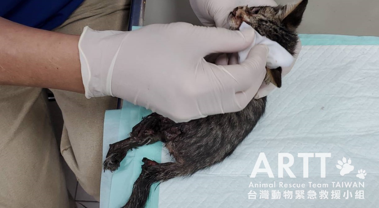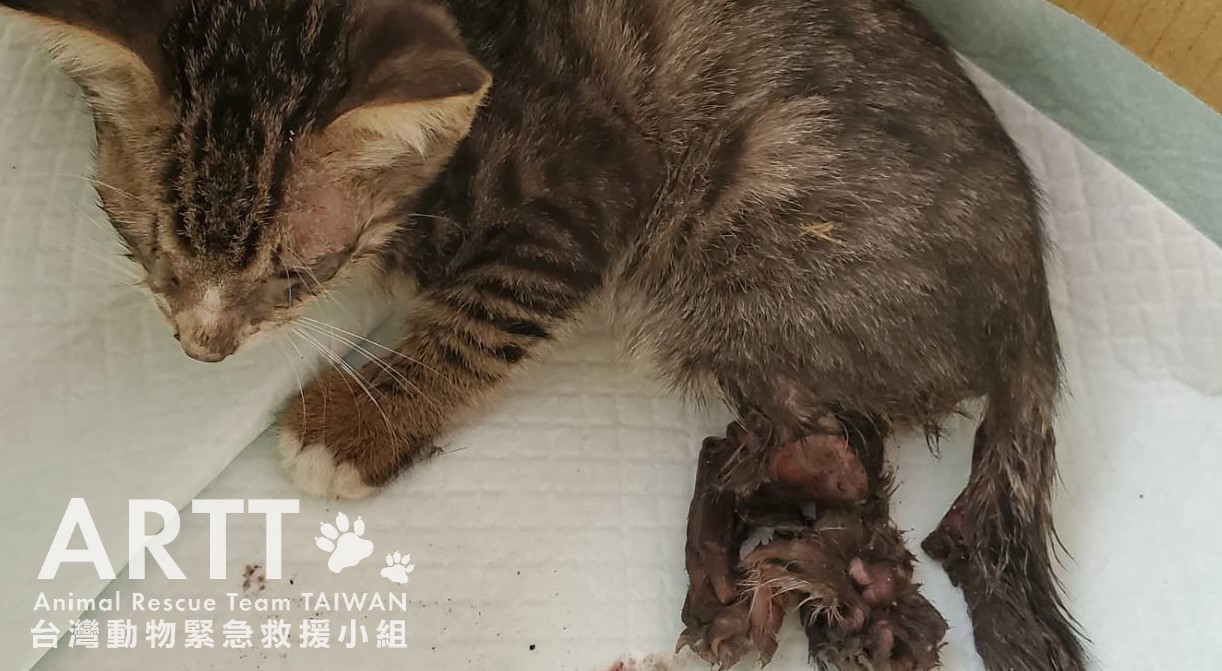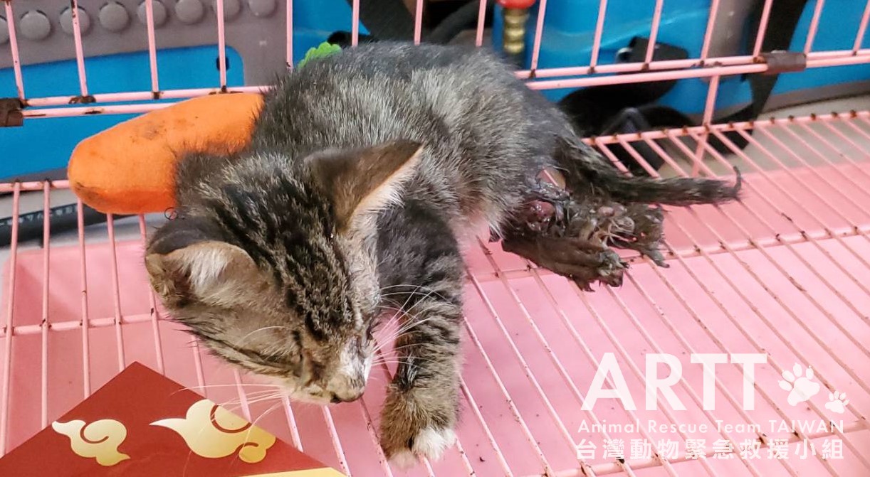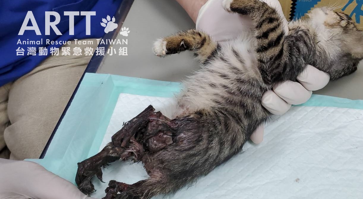 台灣動物緊急救援小組醫療團隊為小貓進行檢傷,小貓僅三個月大,下盤遭重物壓爛,後雙腿及尾巴也都斷裂,目前在獸醫院搶救中,有生命危險。