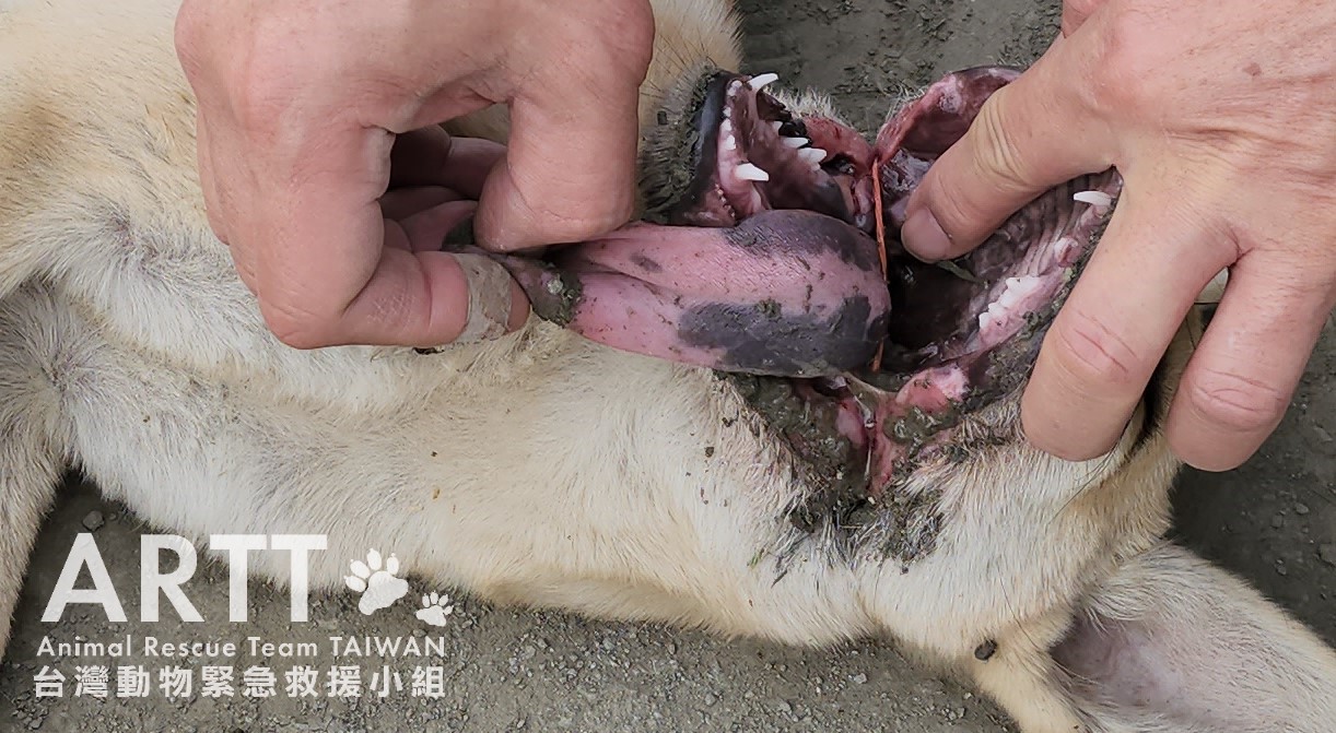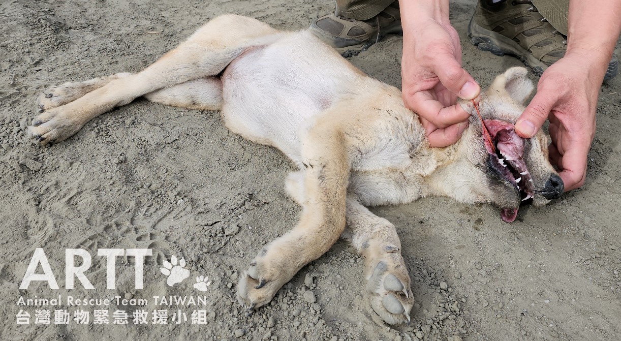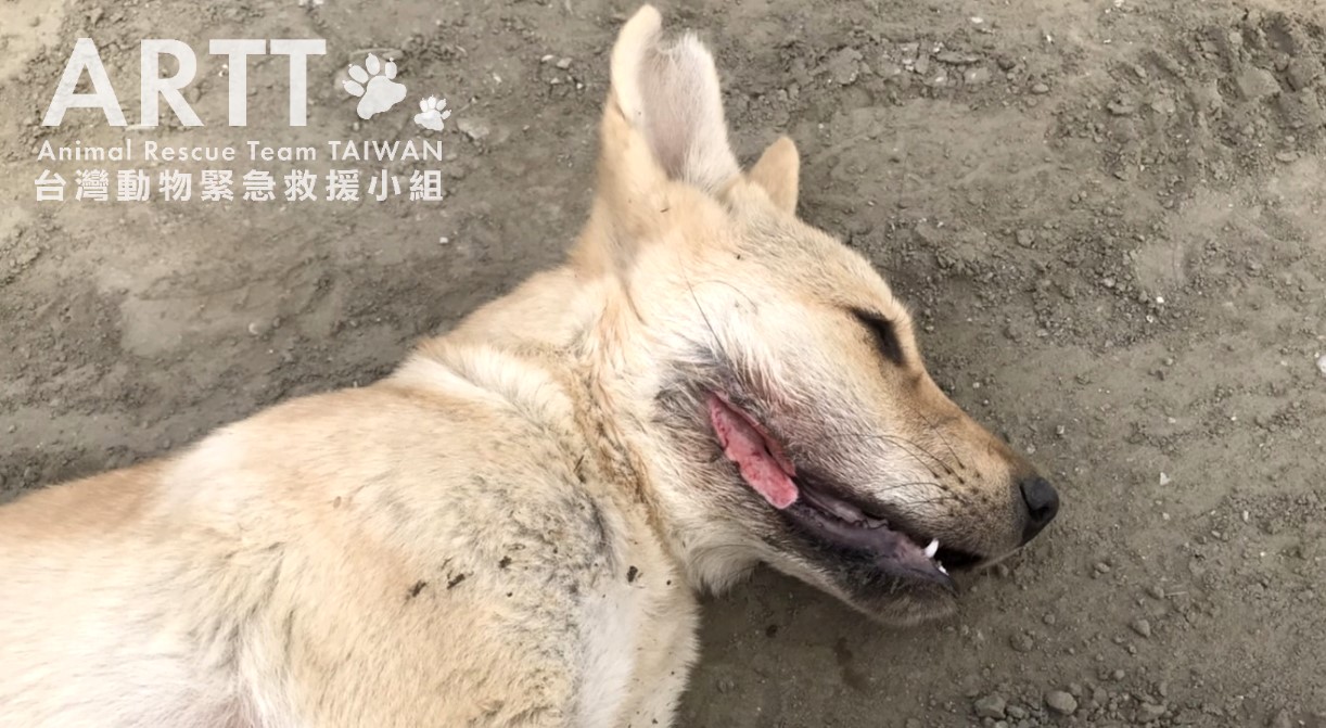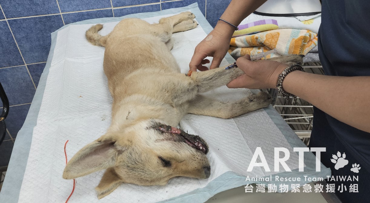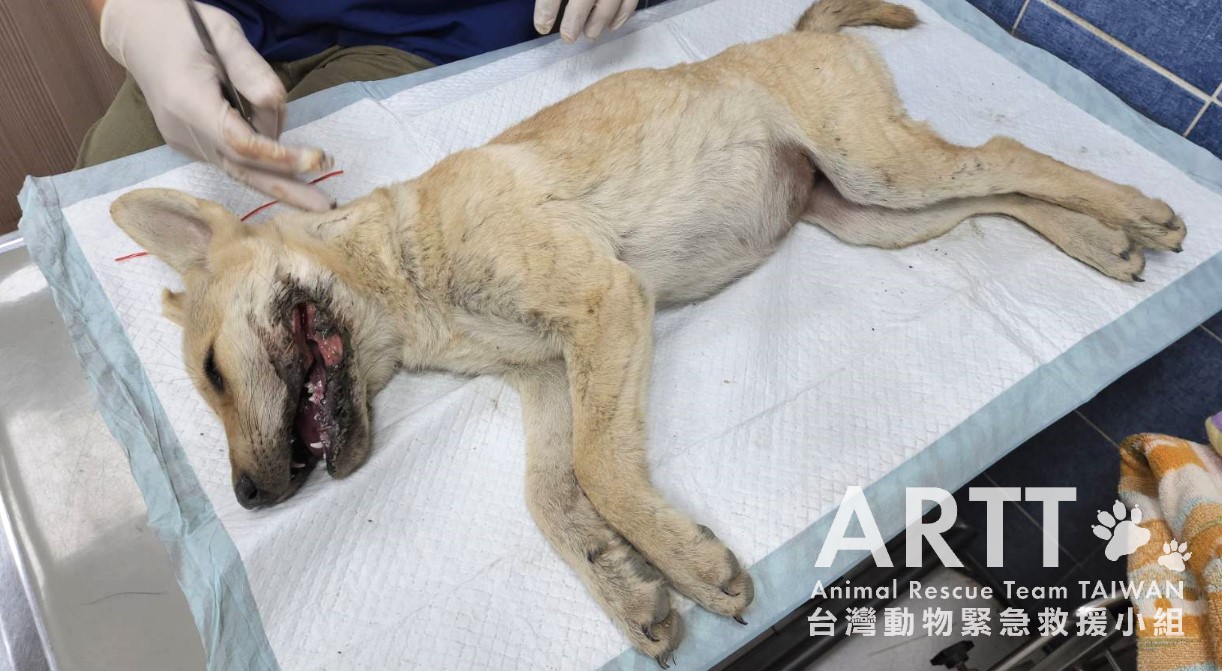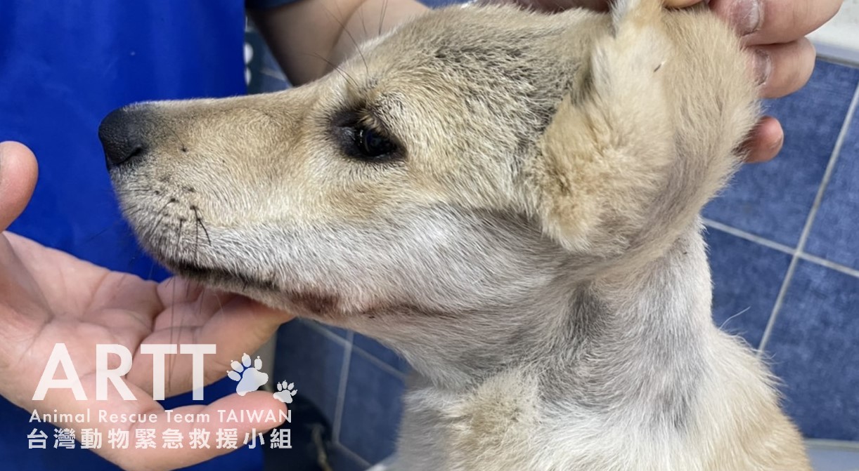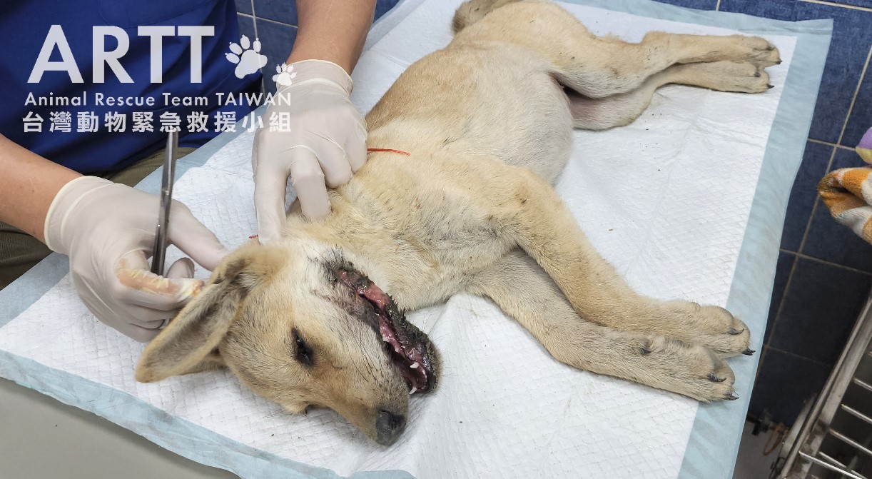 台灣動物緊急救援小組自高雄興達港 救援一隻受傷的幼犬,這隻小狗的嘴角處有嚴重裂傷,為橡皮筋綑綁緊勒造成。台灣動物緊急救援小組救援團隊將幼犬順利捕捉後立即送往動物醫院治療。