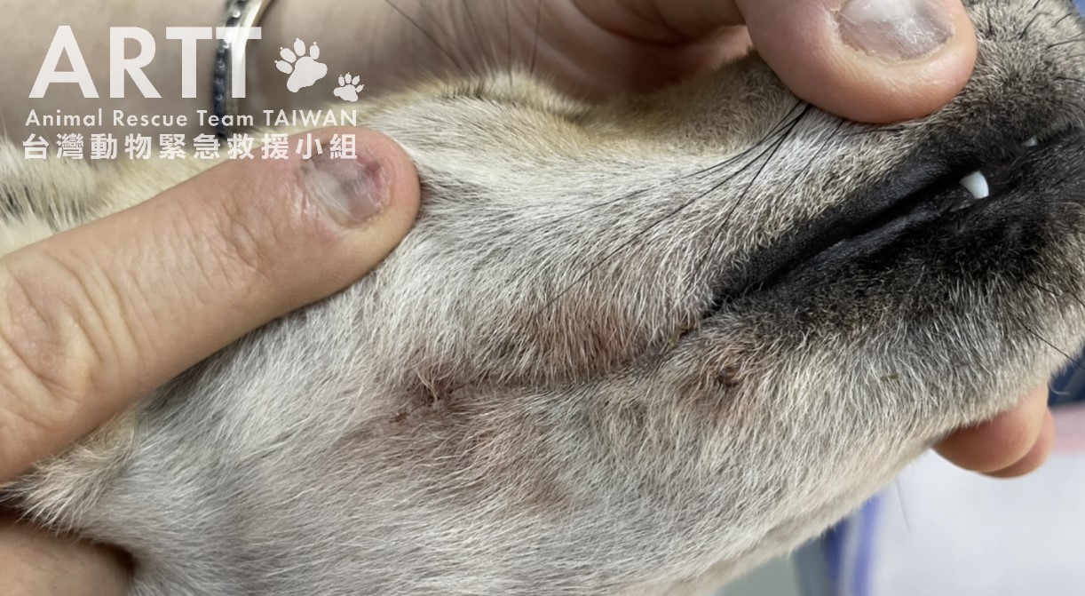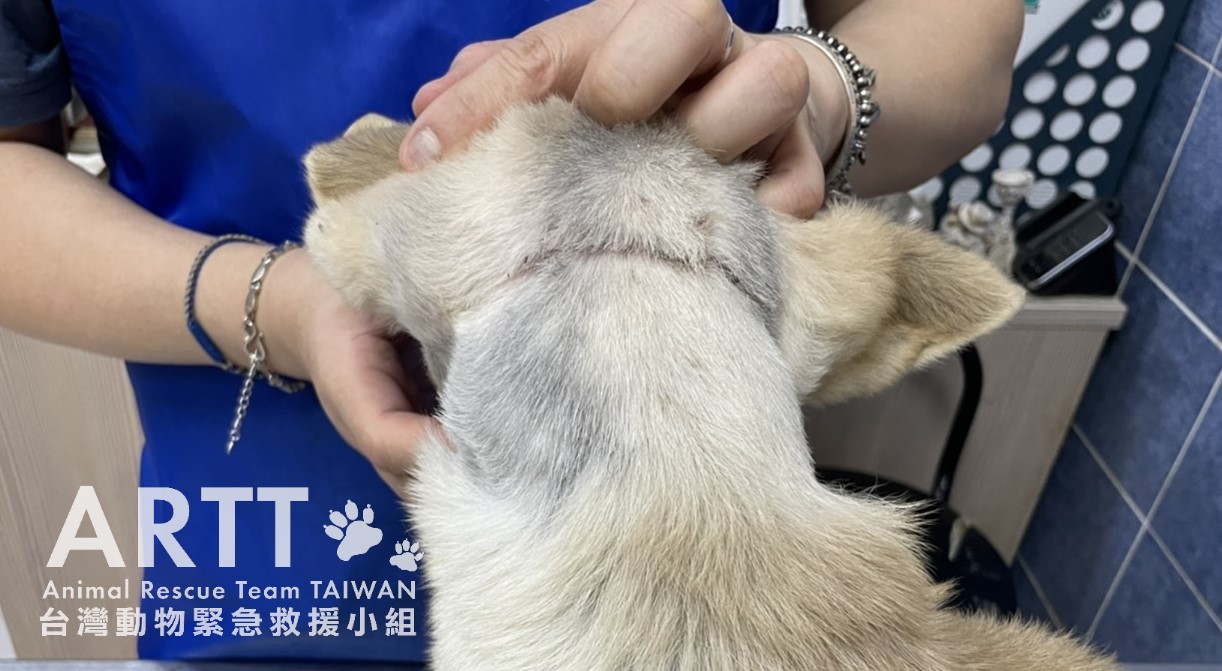 台灣動物緊急救援小組醫療團隊為小幼犬檢查傷口,這隻小幼犬約5個月大,橡皮圈緊緊嵌入皮肉間,造成嘴角處有極深的傷口,潰爛嚴重。推測是翻找便當盒找尋食物時,不慎被橡皮圈套入嘴角到後頸處。透過血檢發現這隻小幼犬還有嚴重的營養不良與脫水症狀。獸醫將橡皮筋移除後清創並縫合傷口,持續留院觀察治療。