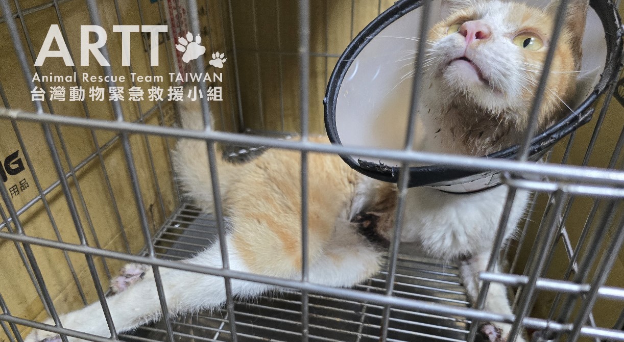台灣動物緊急救援小組於高雄美濃救援一隻右前肢疑遭捕獸夾夾斷的浪貓。貓咪的前腿已有大範圍組織腐爛,僅剩一截白骨外露,傷勢相當嚴重。救援團隊順利捕捉傷貓後,立即將牠送往動物醫院進行檢查與治療。