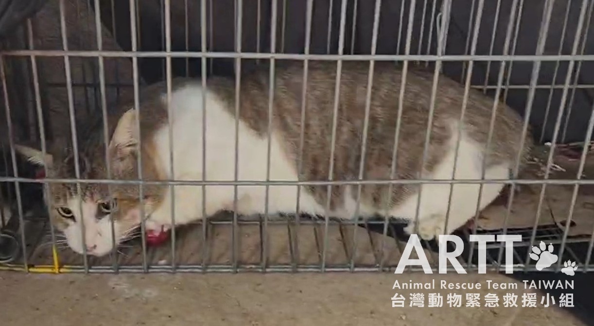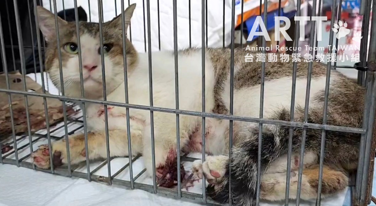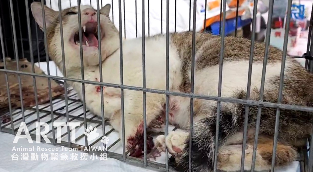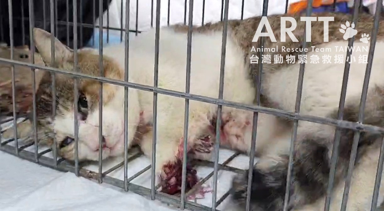 台灣動物緊急救援小組接獲通報,前往台南關廟救援一隻疑遭捕獸夾夾斷左前肢的浪貓。貓咪的左前肢骨頭斷裂、腳掌已消失,傷口血肉模糊。救援團隊成功誘捕後,隨即將傷貓送往動物醫院接受緊急治療。