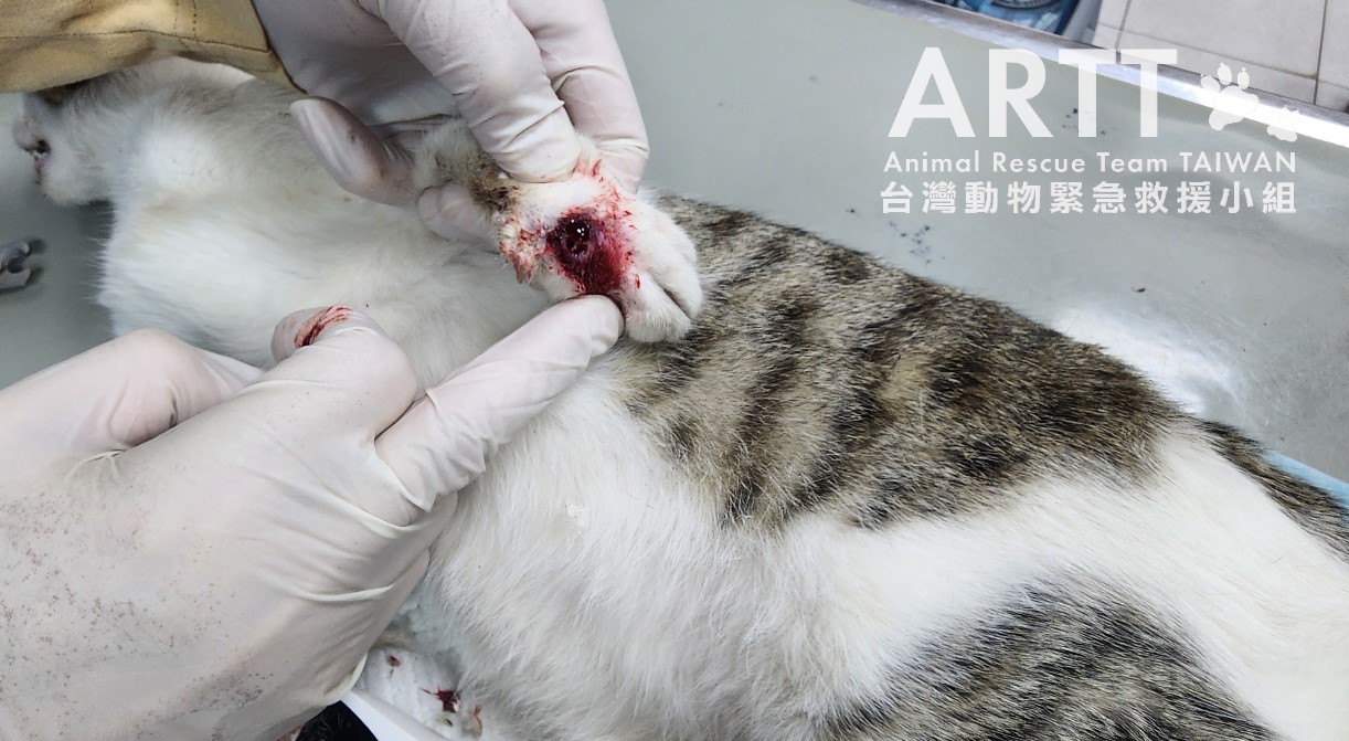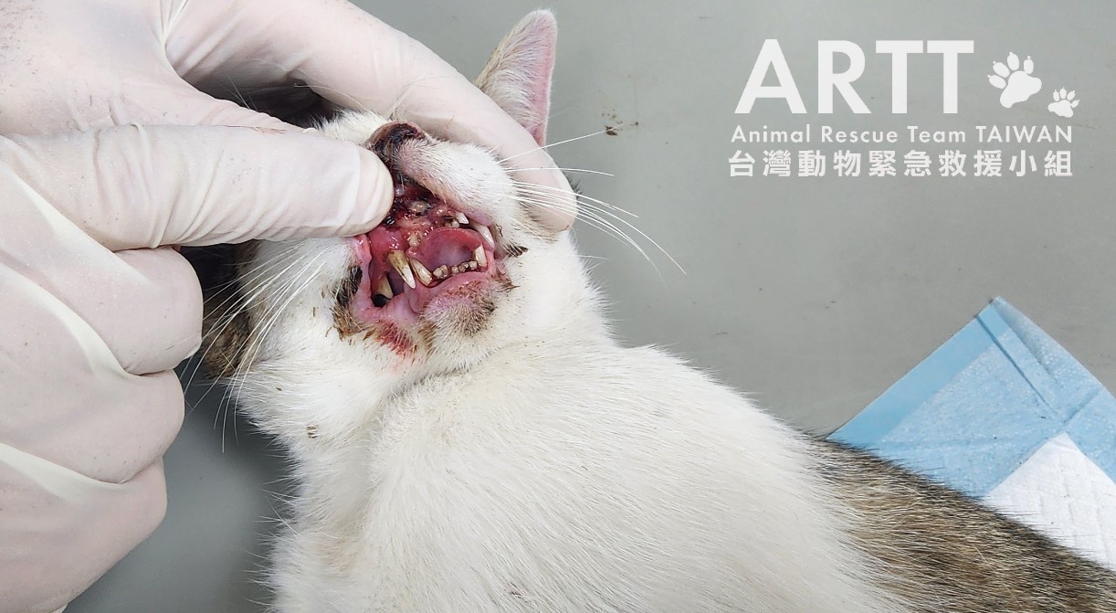 台灣動物緊急救援小組前往嘉義大林救援一隻口腔嚴重潰爛的浪貓。貓咪的上顎與下巴皆有深層傷口並出現明顯潰爛情形,身上亦可見多處外傷,整體狀況不佳。救援團隊順利誘捕後,隨即將貓咪送往動物醫院進行檢查與治療。
