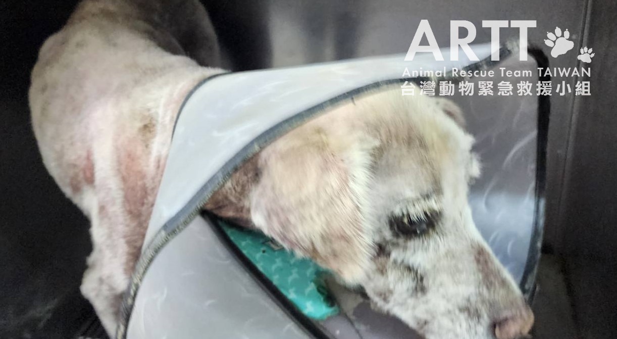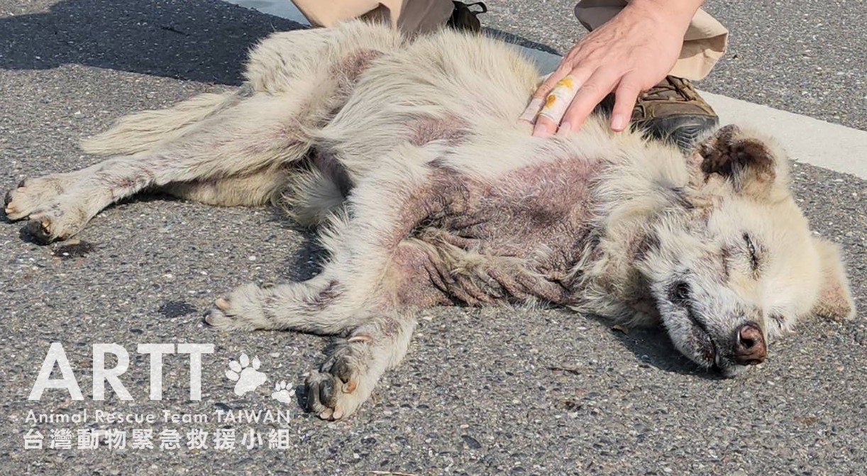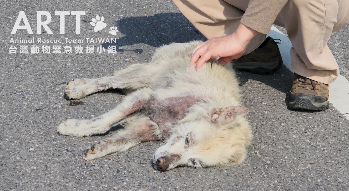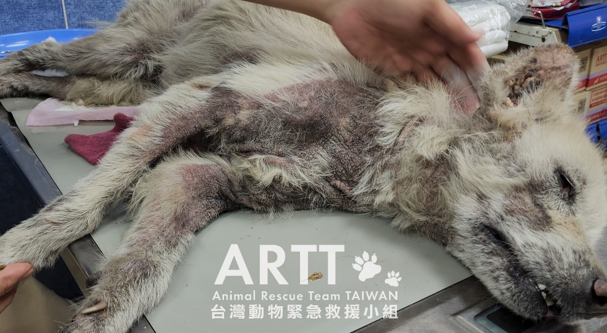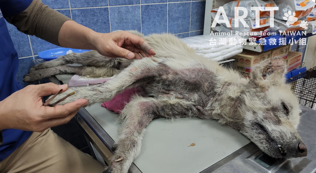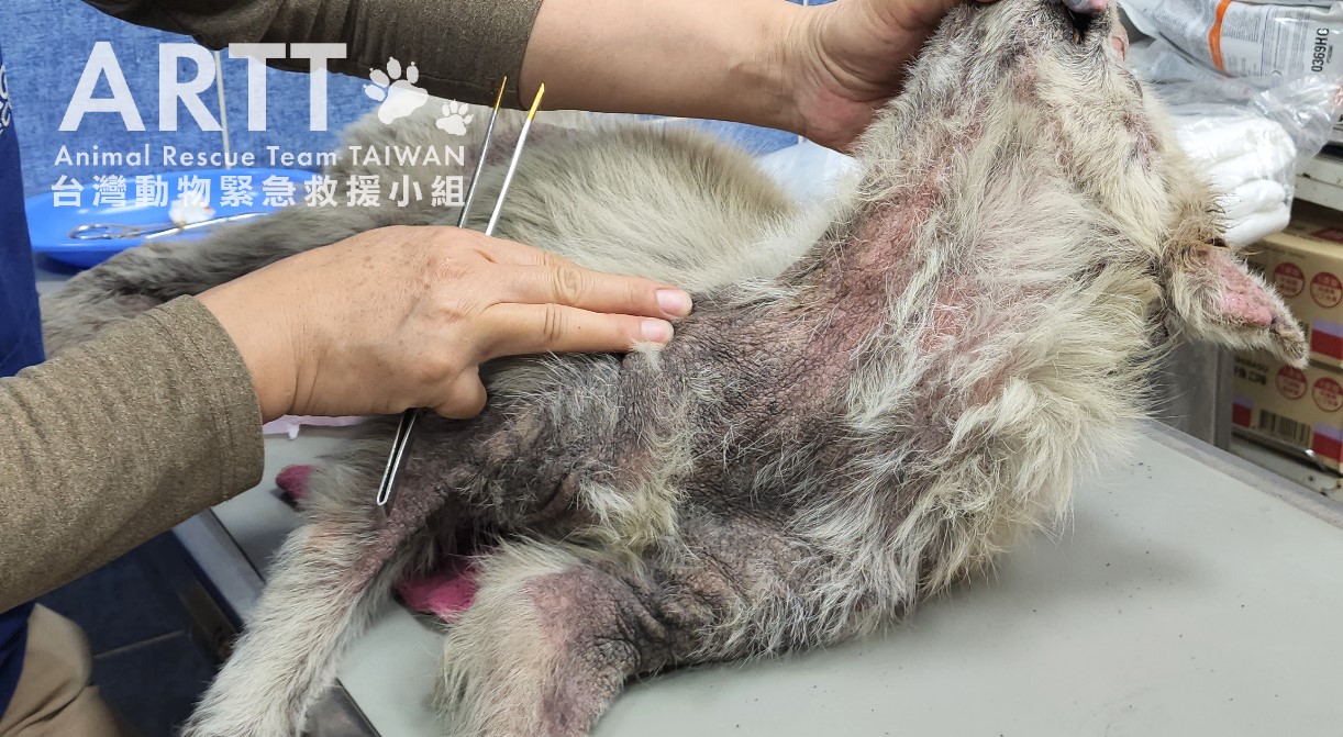 台灣動物緊急救援小組醫療團隊為病犬進行詳細檢查,發現其全身罹患嚴重皮膚疾病,伴隨大面積脫毛及多處外傷。經進一步檢驗,確認狗狗同時存在營養不良與脫水情形,目前已安排狗狗住院治療。由於狗狗罹患嚴重皮膚疾病,整體療程較為漫長,治療狀況短期內較難有明顯的新進展,還請大家耐心等候。