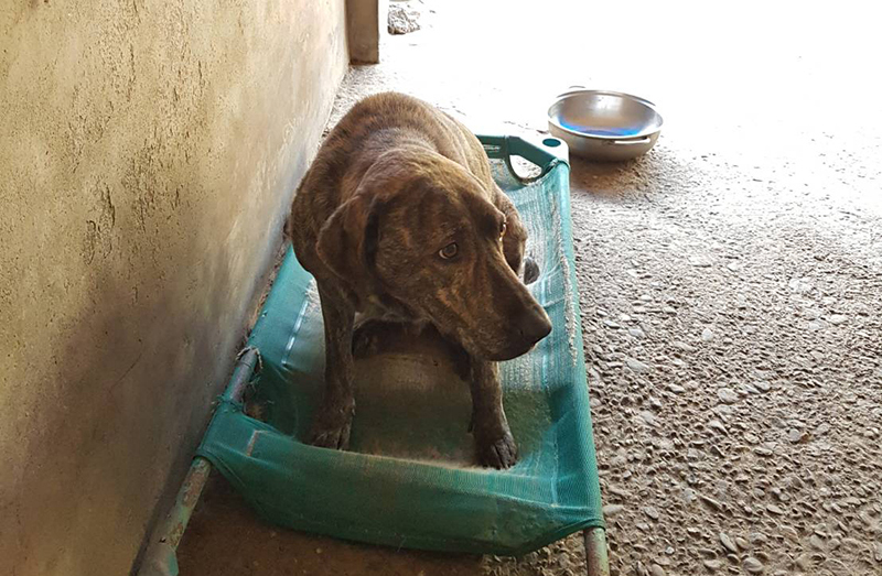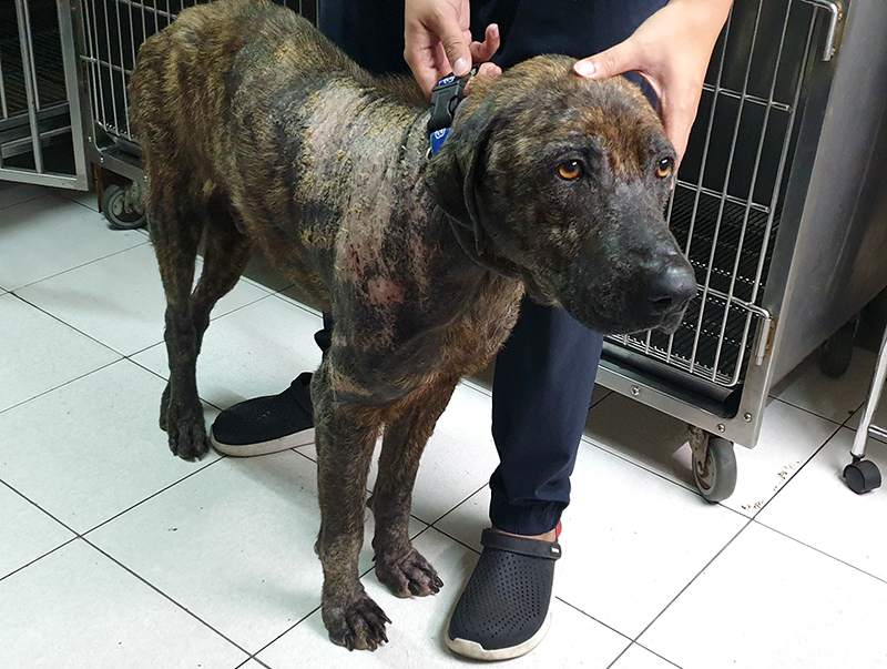 台灣動物緊急救援小組日前於高雄六龜救回一隻全身嚴重皮膚病的浪犬,緊急安置在動物醫院治療中。
