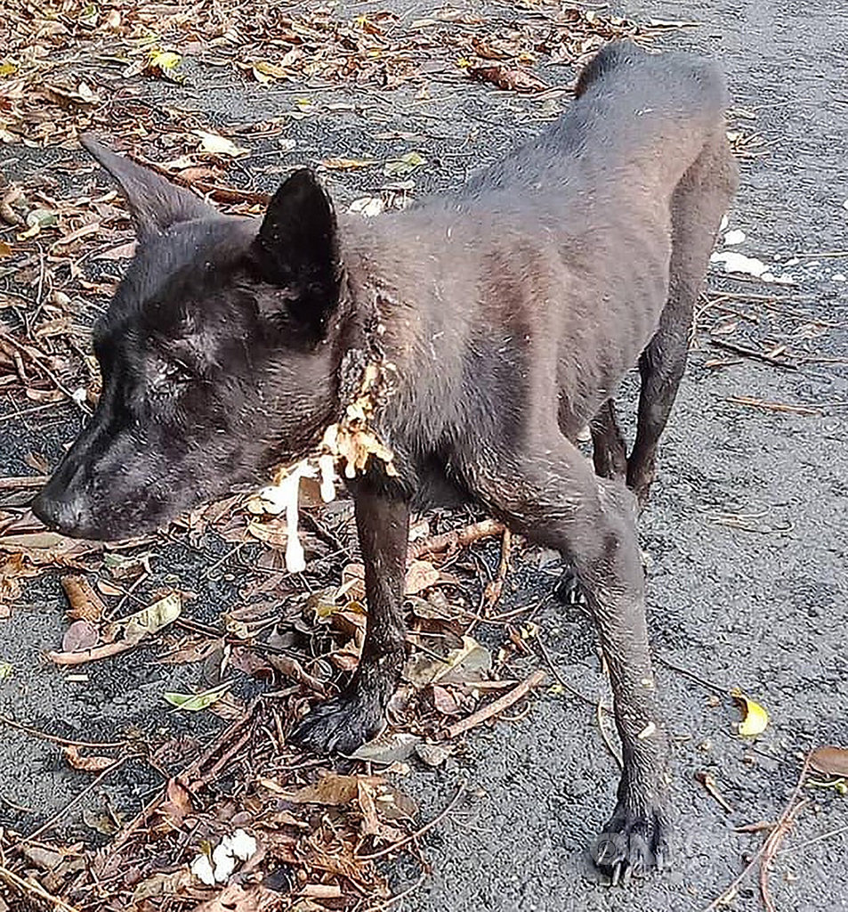 戴姓郵差近日送信途經高雄市荖濃溪林道時,發現路邊一隻黑色流浪犬進食時,食物會不斷從脖子下方流出,於是拍下照片通報台灣動物緊急救援小組。