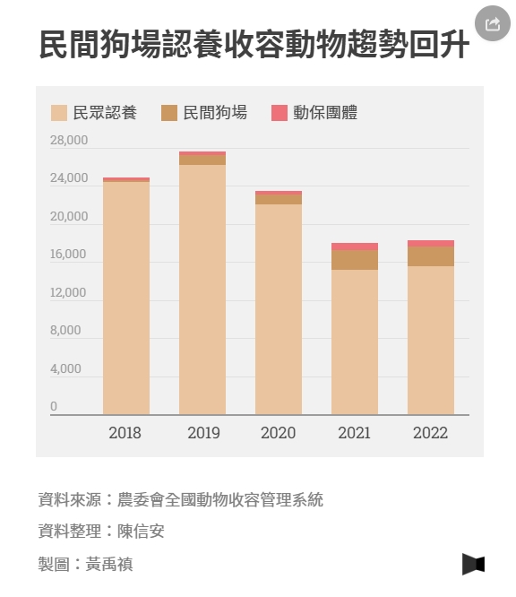 農委會曾統計2015年至2016年4月的認養情形,雖當時全台收容所認養率平均達8成,但民間狗場、動保團體大量認養的比例卻在當中占了近2成,意即有超過1萬隻以上的犬隻並非由一般民眾認養,其中嘉義縣、澎湖縣、雲林縣的動物被民間狗場認養比例皆超過50%以上。