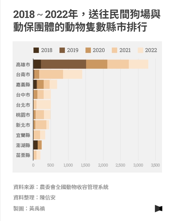 面對野外龐大的遊蕩犬族群,台灣防止虐待動物協會執行長姜怡如指出:「很多里長、里民只要施壓,或找民意代表,即便收容空間已達最高,你很難不收。」從2018年至2022年,仍有近1萬隻的收容動物被民間狗場或動保團體認養,平均每年1,700餘隻,其中高雄市、台南市、嘉義縣排名前三名。