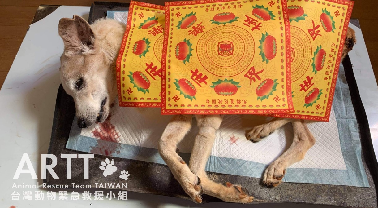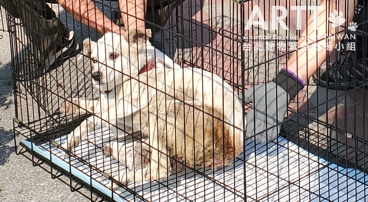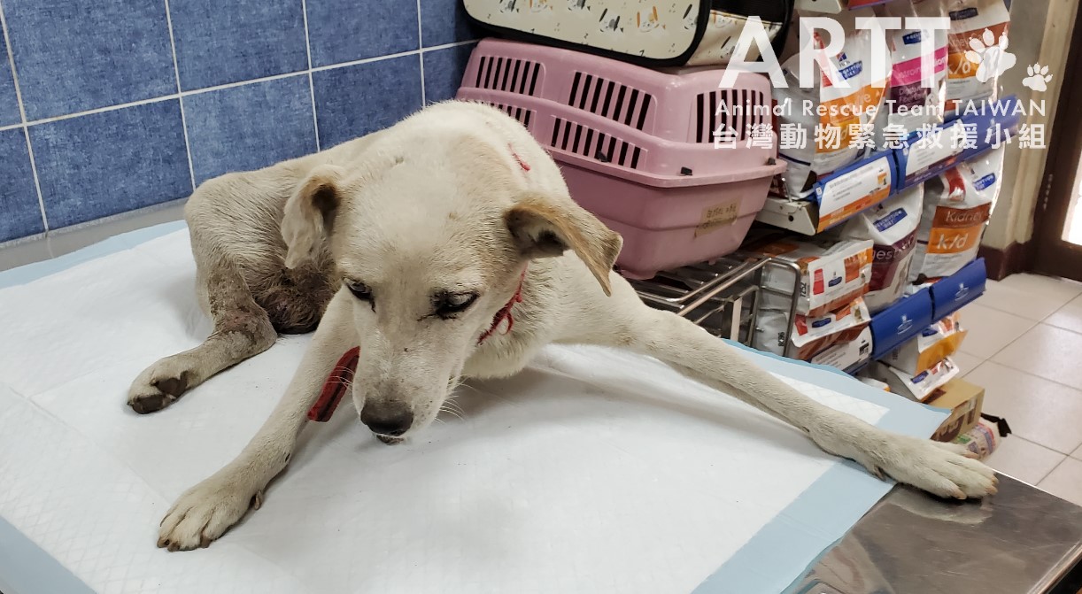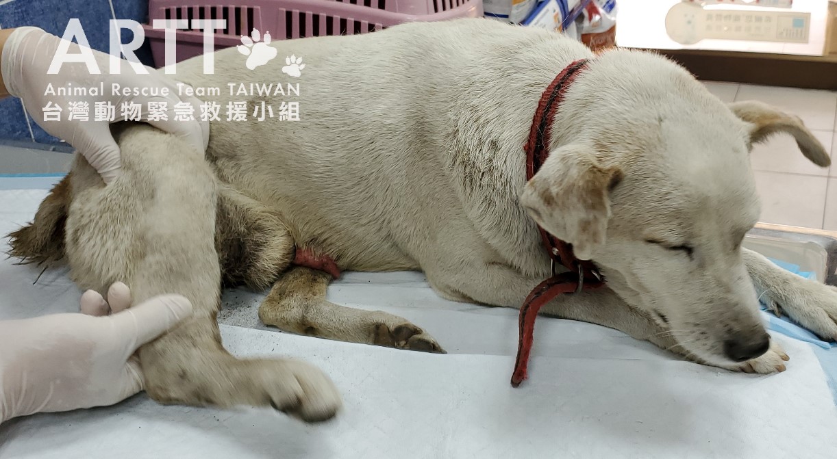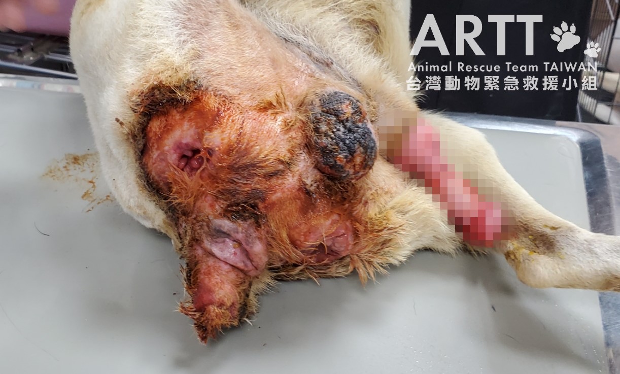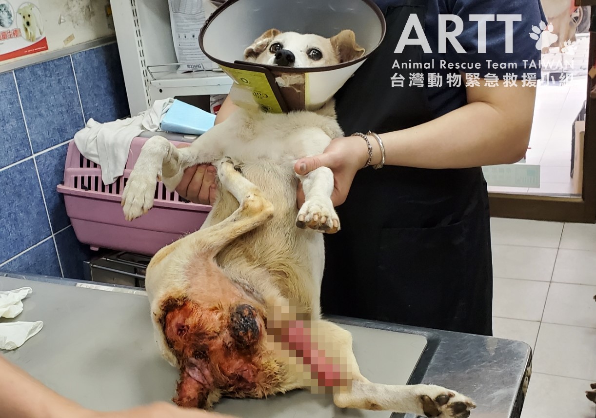 台灣動物緊急救援小組醫療團隊初步檢查後表示,傷犬是年約8歲的公狗,因車禍造成重傷下身癱瘓,褥瘡嚴重潰爛還遭蛆蟲啃咬。