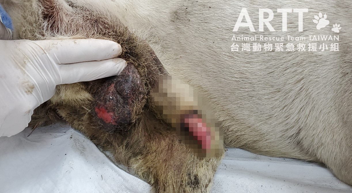 由於傷犬的外傷嚴重,造成生殖器官長期裸露,一直反覆潰爛惡化。