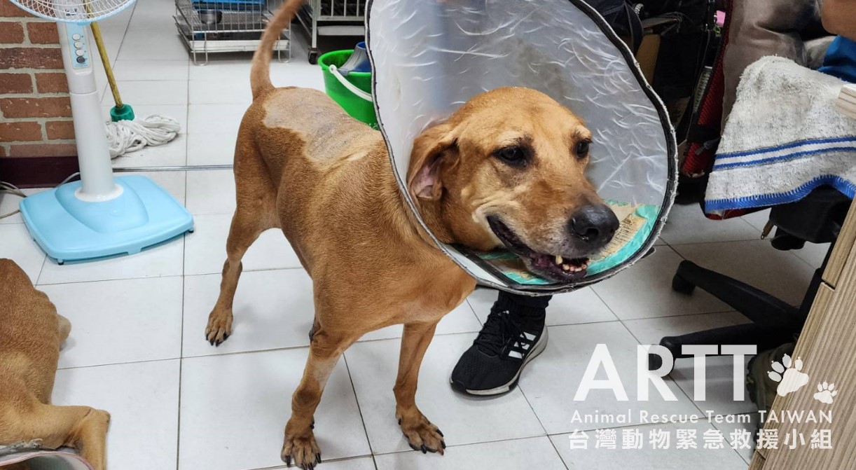 台灣動物緊急救援小組醫療團隊為傷犬進行檢查與治療,商犬全身多處傷痕累累,腹部左側有重撕裂傷。醫療團隊已完成清創縫合,現正留院觀察,密切監控傷勢變化。