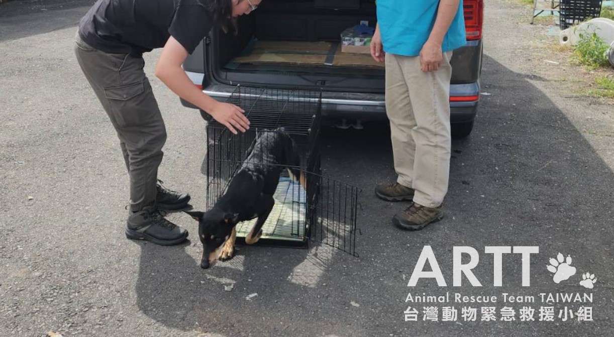 台灣動物緊急救援小組救援團隊深夜前往高雄旗山郊區執行救援任務。這隻狗狗右後腳從大腿與小腿連接處以下斷裂,超過半條小腿已不知所蹤,傷口處一截白骨直接裸露於外,應是遭捕獸夾或山豬吊夾傷後,狗狗在極度痛苦中掙脫逃脫,導致肢體被活生生扯裂。 因天色已晚,救援難度提升許多,憑著微弱手電與當地通報者協助搜尋,救援團隊終於順利將狗狗安全捕捉並送往動物醫院治療。