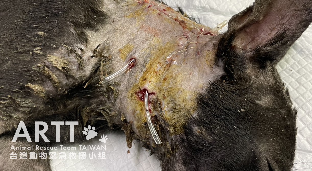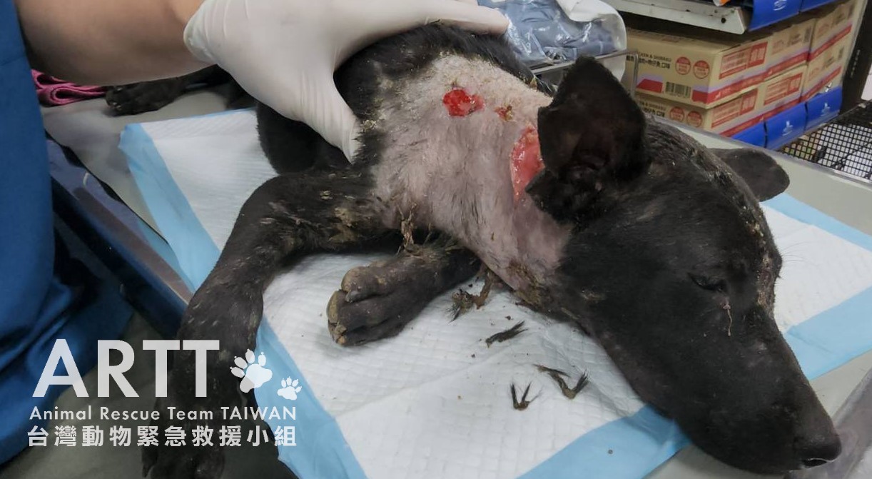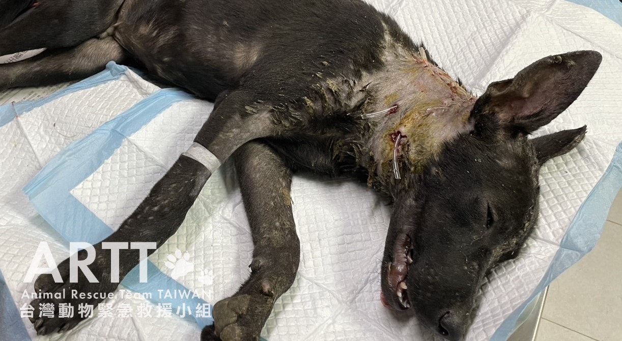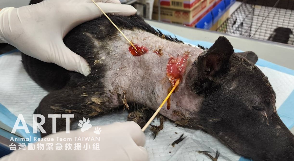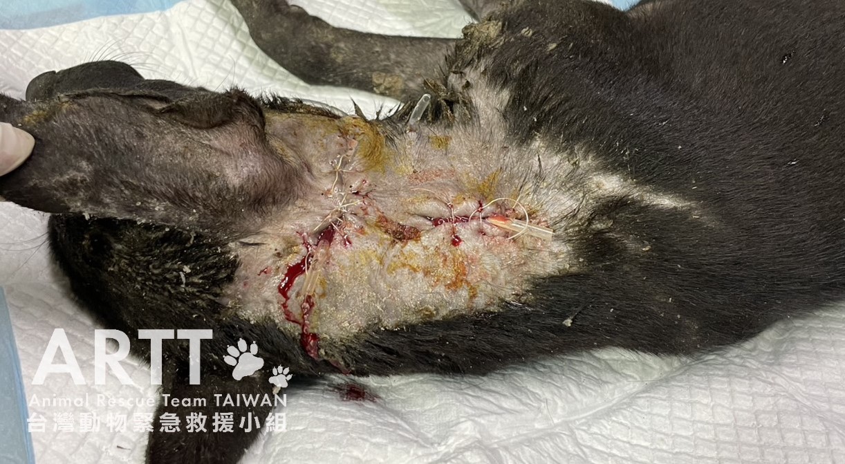 台灣動物緊急救援小組醫療團隊為傷犬進行治療,經清創縫合後,持續留院觀察與治療中,以防傷勢惡化。
