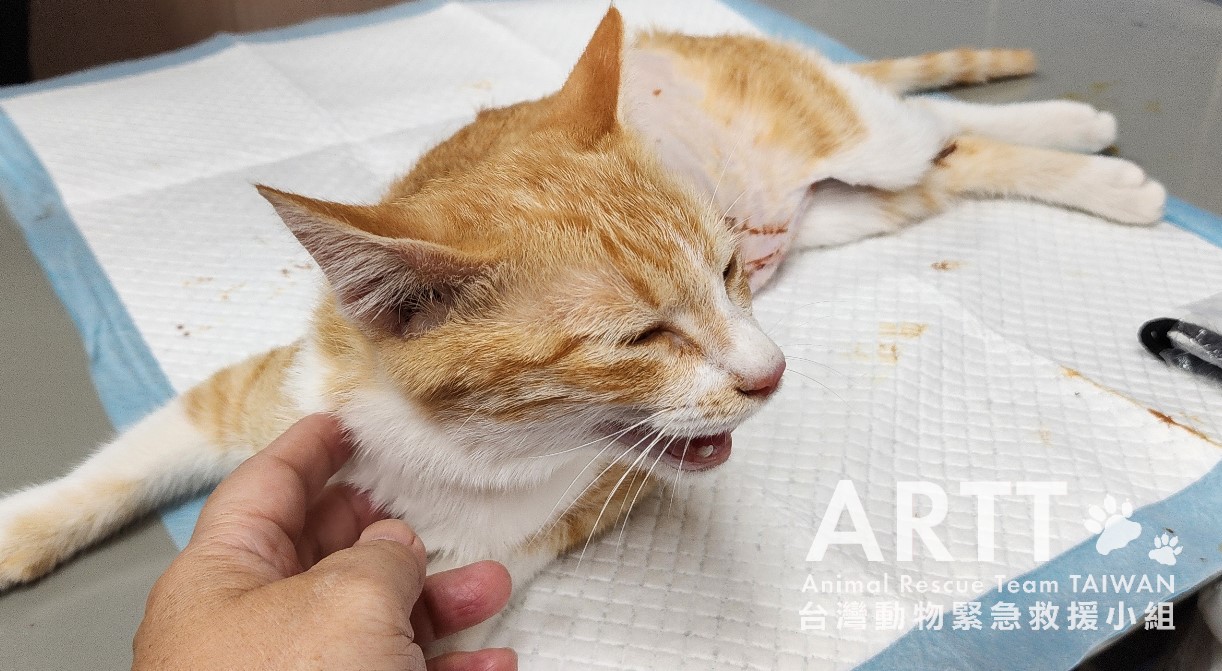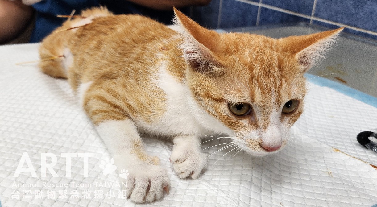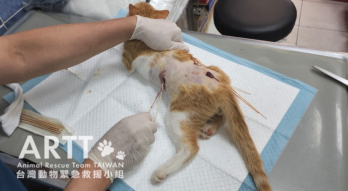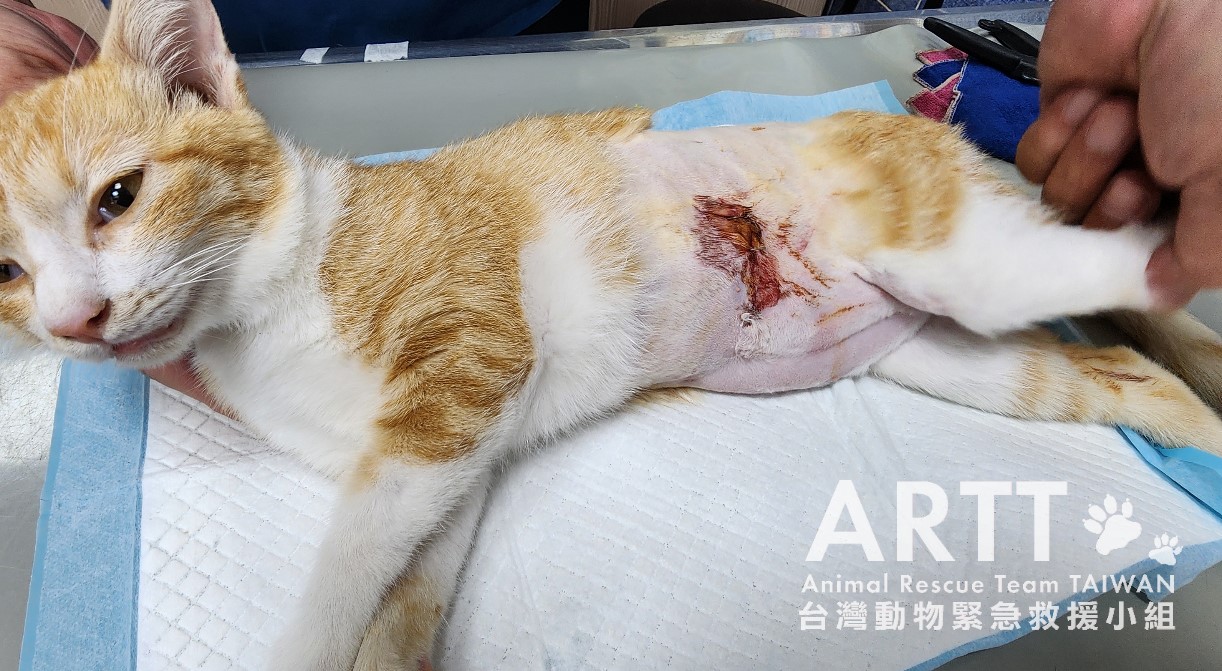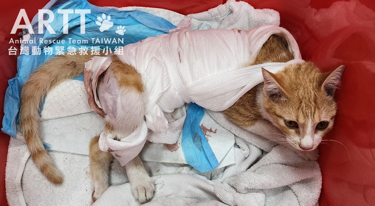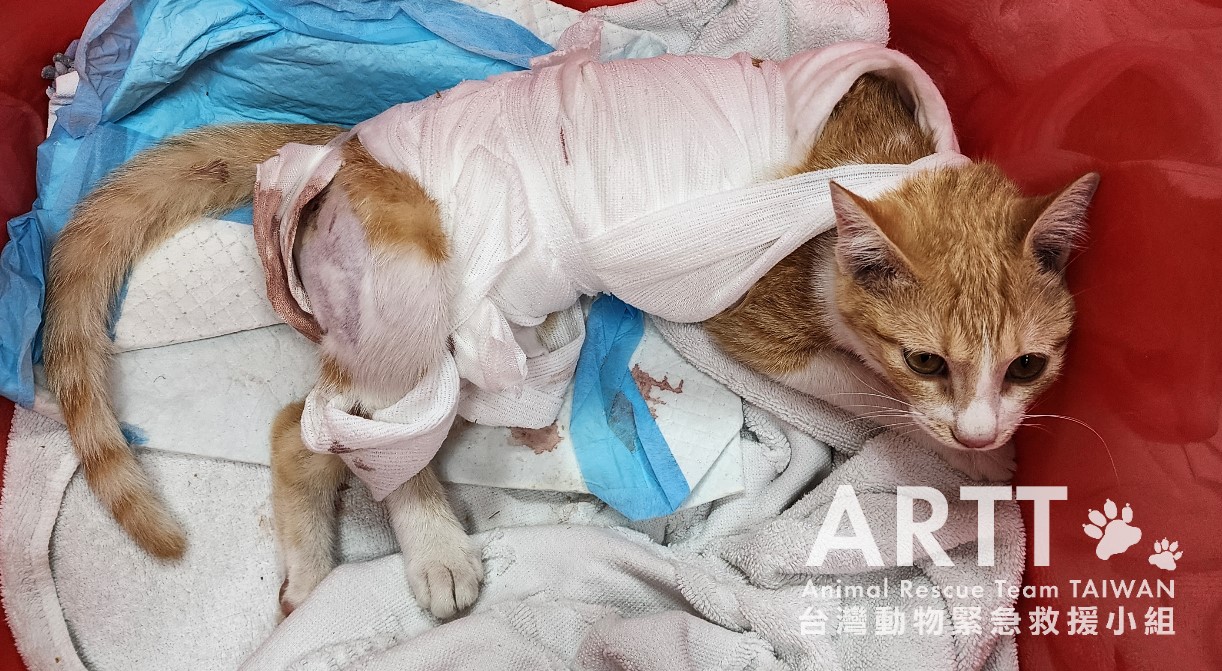 台灣動物緊急救援小組醫療團隊接手後重新進行檢查,貓咪全身多處有被撕咬的傷口,脊髓錯位,腹部嚴重感染、腸道外露,獸醫立即進行更深入的清創與縫合手術。血液檢查顯示各項指數皆不理想,目前貓咪無法自行排便與排尿,需以人工方式協助,已裝設導尿管;進食方面仍仰賴灌食輔助,持續留院觀察治療。