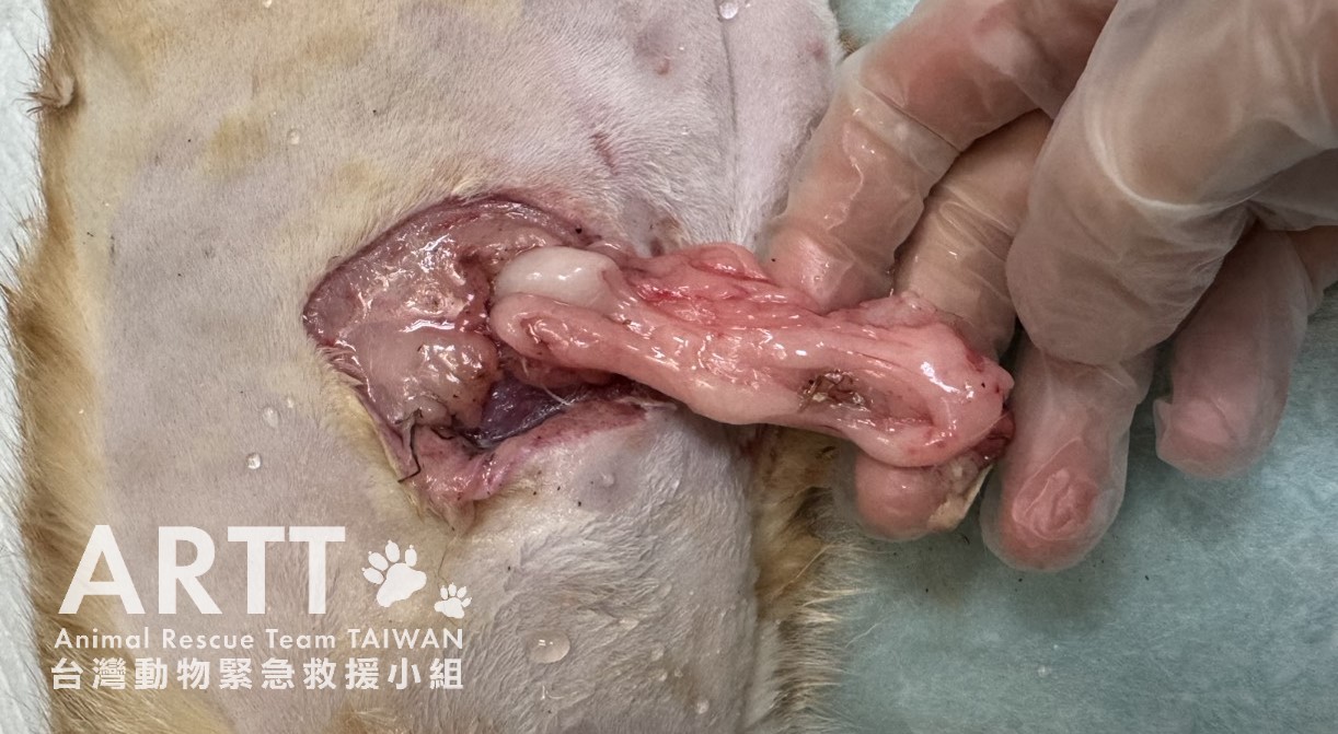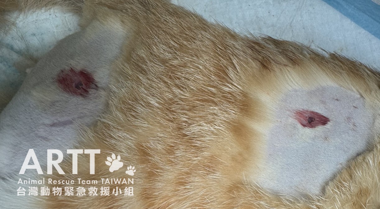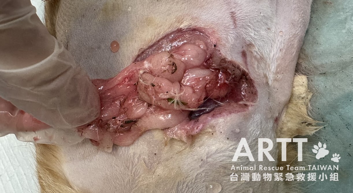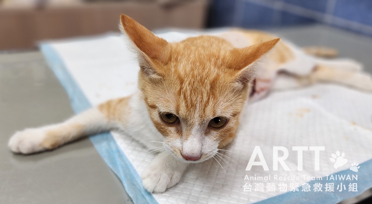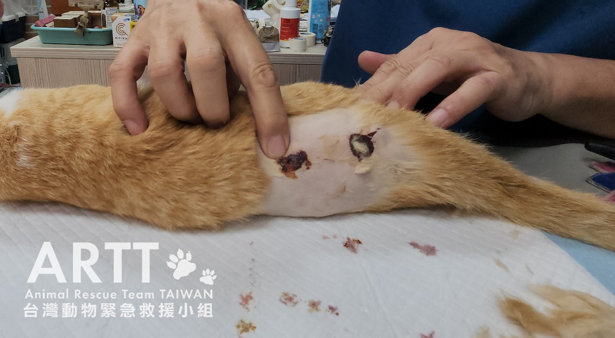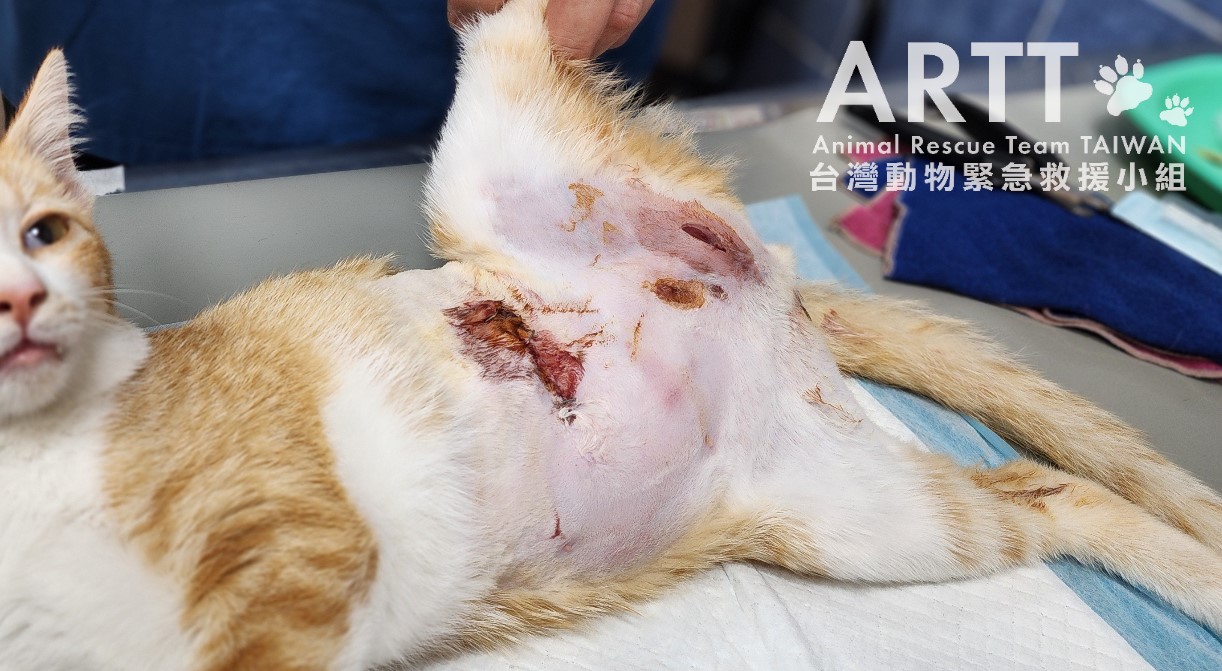 台灣動物緊急救援小組醫療團隊接手後重新進行檢查,貓咪全身多處有被撕咬的傷口,脊髓錯位,腹部嚴重感染、腸道外露,獸醫立即進行更深入的清創與縫合手術。血液檢查顯示各項指數皆不理想,目前貓咪無法自行排便與排尿,需以人工方式協助,已裝設導尿管;進食方面仍仰賴灌食輔助,持續留院觀察治療。