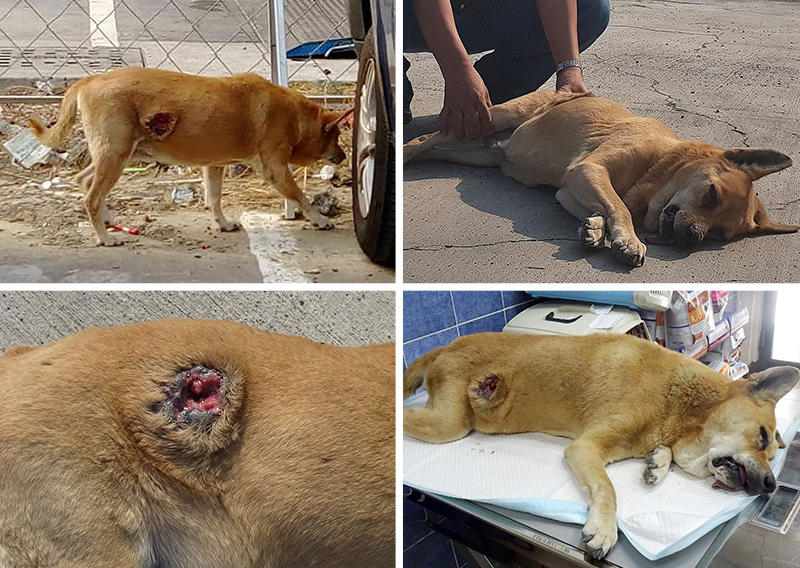 台灣動物緊急救援小組日前接獲通報,工協市場的停車場旁近日出現一隻黃色流浪狗,上周被人用彈弓和石頭攻擊,造成狗兒重傷,背部右側大面積潰爛、血流如注,許多熱心民眾不捨想救牠送醫,但是狗狗因為有傷在身加上人為傷害,見人靠近就躲,幾天下來傷勢更加嚴重。