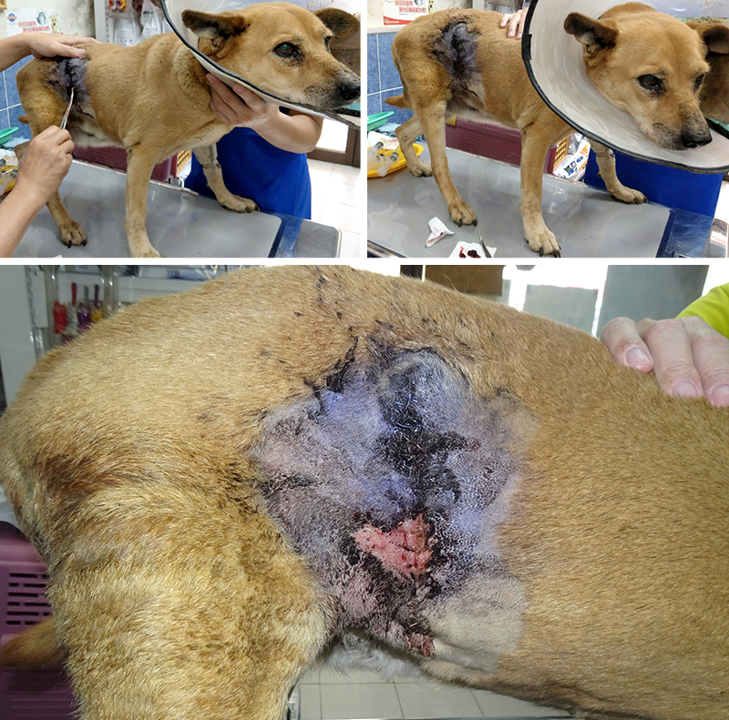 狗狗到達醫院後馬上接受清創手術,獸醫表示,這個傷口達5公分,因為感染嚴重已經潰爛流膿,清創、縫合後暫無生命危險,不過仍須接受抗生素治療,大約1個月才能痊癒。